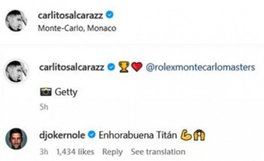 - Čestitke, titane - napisao je Novak ispod slike koju je Karlos objavio sa peharom u ruci.