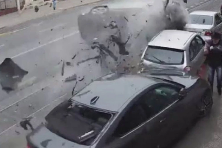 Na snimcima nadzorne kamere vidi se kako se Audi punom brzinom zabija u parkirani automobil i usput udari još nekoliko vozila.
