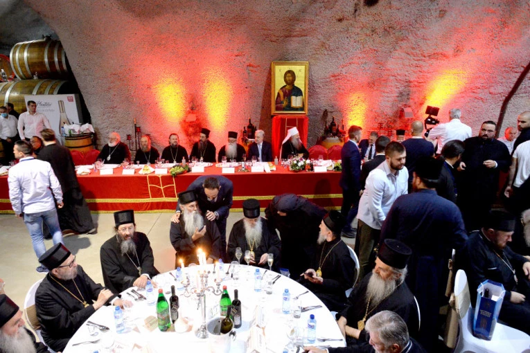 Za glavnim stolom u autentičnom restoranu kompanije Platanže u čelu sede patrijarh Porfirije, sa njegove desne strane je premijer Zdravko Krivokapić, a sa leve mitropolit Joanikije.
