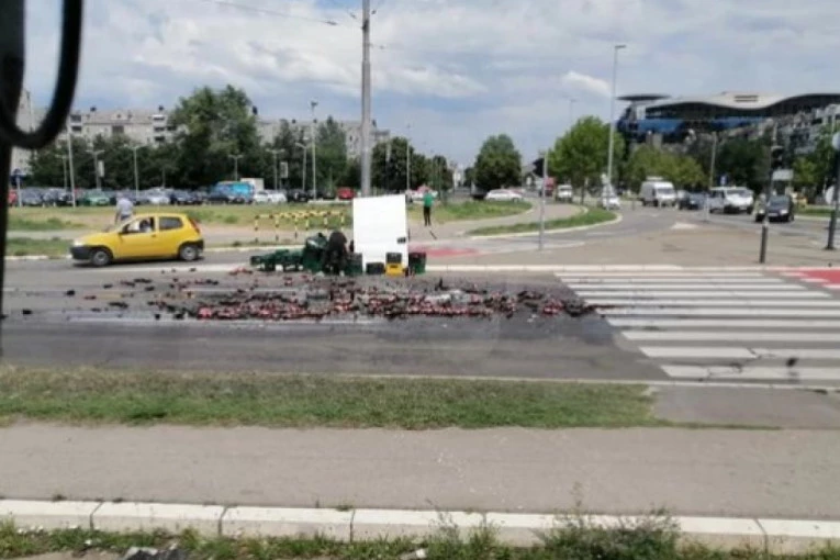 Foto: FACEBOOK/VOZAČI TRAMVAJANaime, do nje je došlo kada su se na kombiju koji je transportovao pivo, pri vožnji otvorila vrata, pa je veliki broj staklenih flaša završio na ulici.