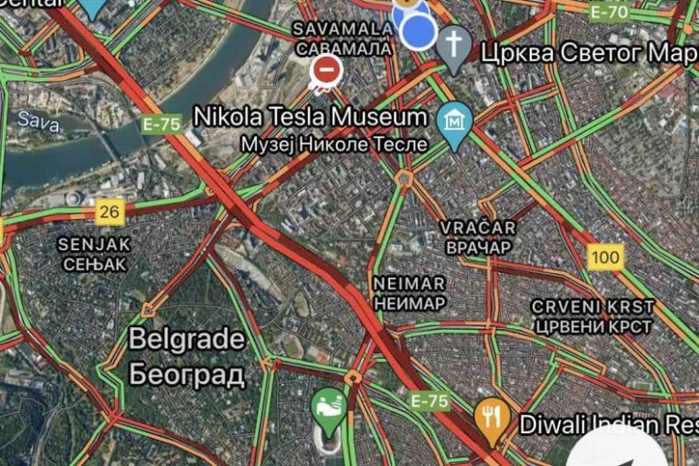 Ako je verovati poznatom servisu IT giganta, tako je autoput E75 gotovo u potpunosti blokiran, a ništa bolja situacija nije ni na Senjaku, Dedinju, Crvenom Krstu, Dušanovcu ili u samom centru Beograda.