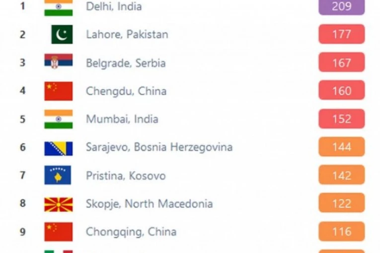 Da bi vazduh bio posmatran kao nezagađen, nivo PM 2.5 čestica ne bi trebalo da prelazi 50, a on danas, prema podacima sajta "AirVisual" iznosi čak 173! Na poziciji najzagađenijeg grada u Srbiji sa prestonicom se smenjuje i Čačak, gde nivo PM čestica varira iz minuta u minut od 164 do 167. U crvenoj zoni nalaze se i Kosjerić, Užice i Novi Pazar.