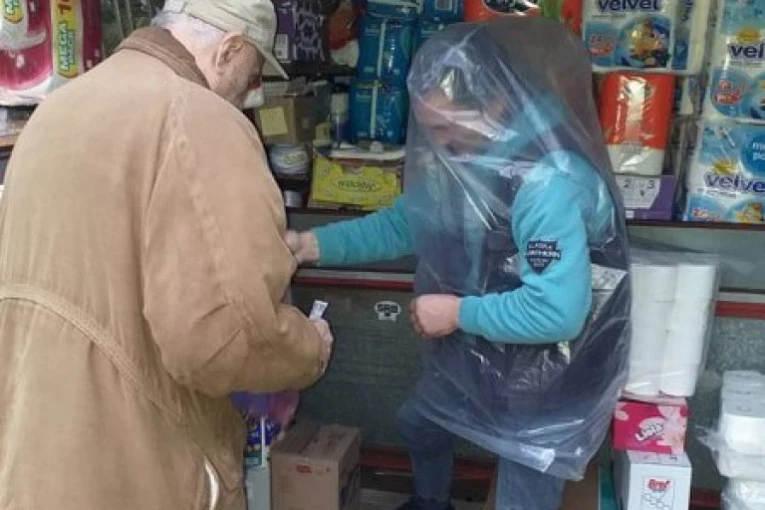 Foto: twitter.com/rajmax63Naime, u pitanju je prodavac na pijaci u Bačkoj Palanci koji je na sebe navukao plastičan džak , kako bi se, sačuvao od "svih mogućih virusa".