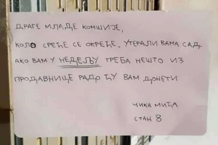 - Drage mlade komšije, kolo sreće se okreće. Uterali vama sad. Ako vam u nedelju treba nešto iz prodavnice, rado ću vam doneti. Čika MIća, stan broj 8 - stoji na obaveštenju