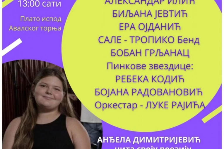 U subotu 03. oktobra od 13 časova na platou ispod Avalskog tornja, održaće se humnitarni koncert za Anđelu Dimitrijević koja boluje od spinalne mišićne atrofije.
