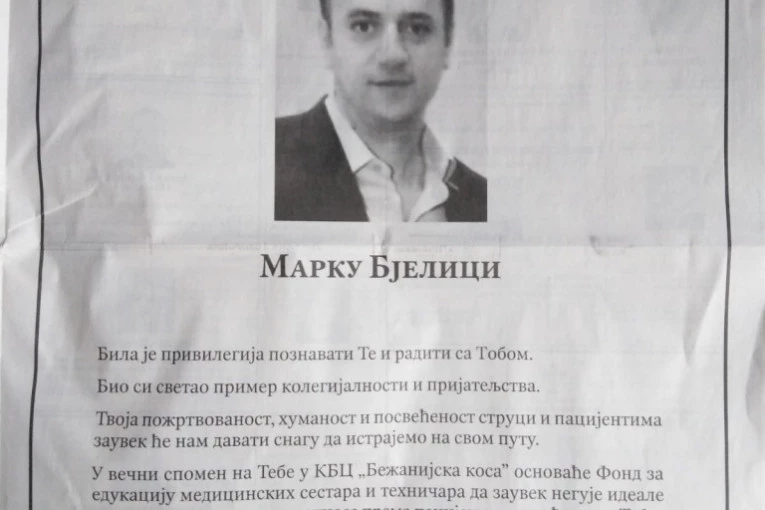 Kako je još napisano u pozdravi Marku Bjelici, u njegov večni spomen u KBC "Bežanijska kosa" biće osnovan fond za edukaciju medicinskih sestara i tehničara.