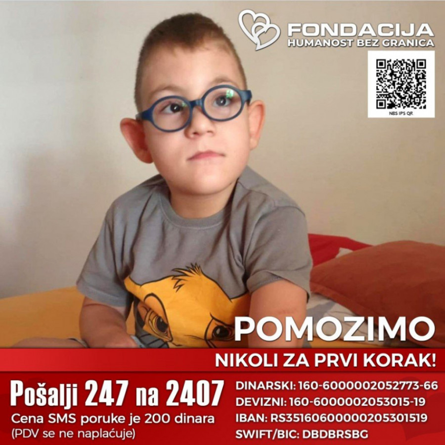 Ovim putem molimo sve ljude dobre volje da pomognu Nikoli da napravi svoj prvi korak, tako što će preko FONDACIJE – humanost bez granica poslati SMS sa brojem 247 na 2407. Uplate za pomoć u lečenju mogu da se izvrše i na dinarski i devizni račun korisnika i putem E-doniraj internet plaćanjem platnim karticama iz celog sveta, kao i preko platforme PayPal.