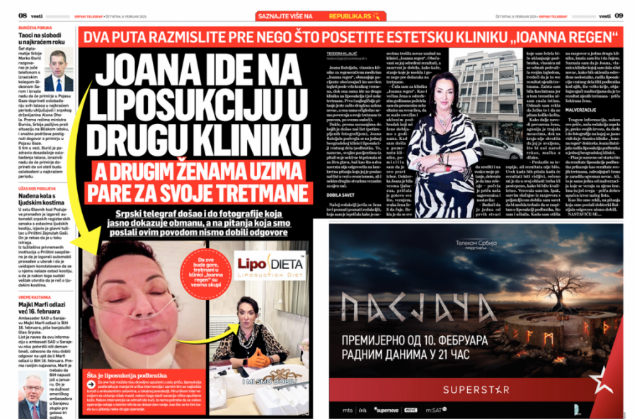 Podsetimo, Srpski telegraf je protekle nedelje objavio tekst o Joani i njenoj klinici, koja je obmanjivala klijente da se zahvaljujući tretmanima koji se rade kod nje u klinici rešila podbratka, a zapravo je išla na liposukciju.