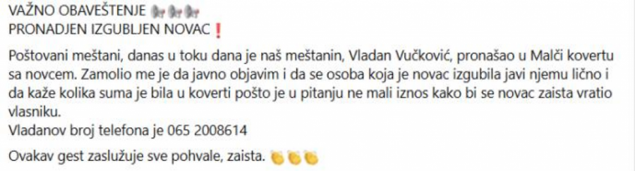Vučković je posredstvom društvenih mreža i medija pozvao vlasnika da mu se javi, međutim očigledno te objave nije video onaj ko je izgubio kovertu sa parama.
