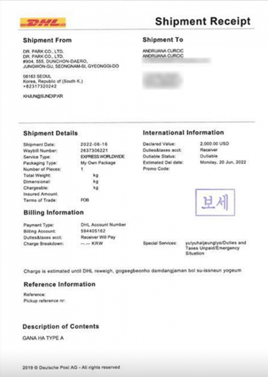Prema dokumentima u koje je Srpski telegraf imao uvid, GANA HA joj stiže direktno iz Južne Koreje, preko DHL i na njeno ime, odakle ga dalje distribuira zainteresovanima, bez obzira što se radi o neregistrovanom preparatu.
