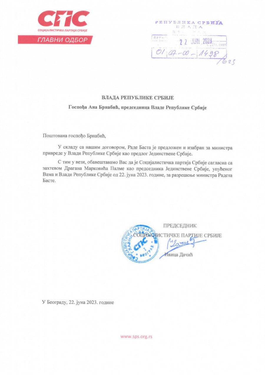 U zahtevu koji su poslali premijerki Vlade Srbije Ani Brnabić Ivica Dačić i Dragan Marković Palma su naveli i saopštenje za javnost u kojem su ranije naveli da Basta ima rok da podnese ostavku na sve funkcije na koje ga je predložila njihova koalicija, a što uključuje i funkciju ministra za privredu u Vladi Srbije.