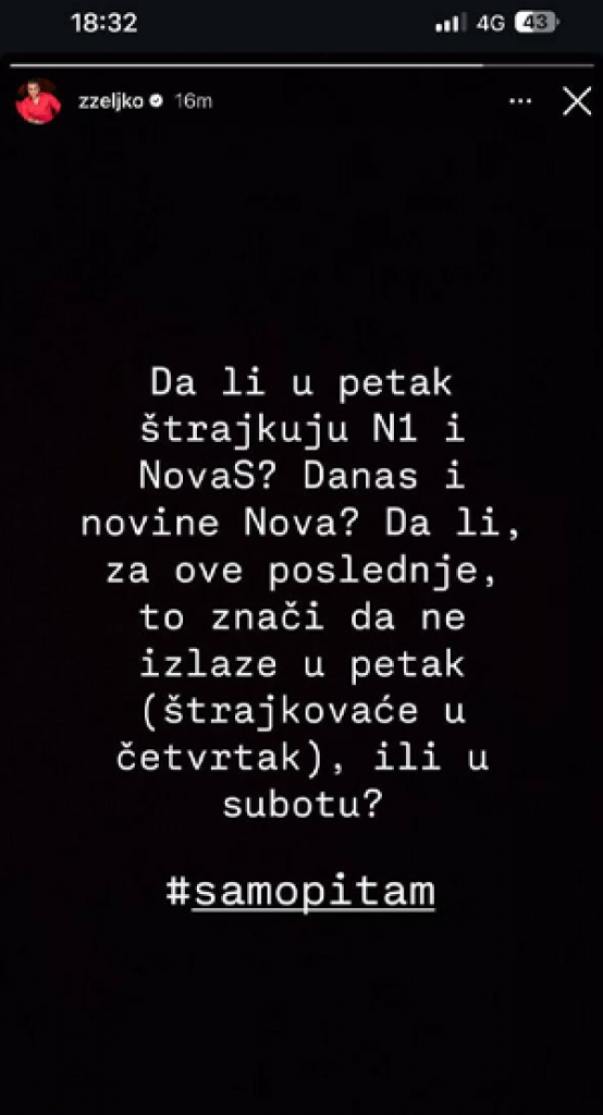 - Da li u petak štrajkuju N1 i Nova S? Danas i novine Nova? Da li za ove poslednje, to znači da ne izlaze u petak (štrajkovaće u četvrtak) ili u subotu? Samo pitam - napisao je Joksimović na društvenim mrežama.