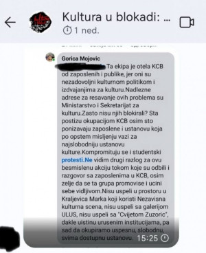 - Ta ekipa je otela KCB od zaposlenih i publike, jer oni su nezadovoljni kulturnom politikom i izdvajanjima za kulturu. Nadležne adrese za rešavanje ovih problema su Ministarstvo i Sekretarijat za kulturu. Zašto nisu njih blokirali? Šta postižu okupacijom KCB, osim što ponižavaju zaposlene i ustanovu koja po opštem mišljenju važi za najslobodniju ustanovu kulture. Kompromituju se i studentski protesti. Ne vidim drugi razlog za ovu besmislenu akciju tokom koje su odbili i razgovor sa zaposlenima u KCB, osim želje da se ta grupa promoviše i učini sebe vidljivom. Nisu uspeli u prostoru u Kraljevića Marka, koji koristi Nezavisna kulturna scena, nisu uspeli sa galerijom ULUS, nisu uspeli sa "Cvijetom Zuzorić", dakle uistinu uruđenim institucijama, pa sad da okupiramo uspešnu, slobodnu, svima dostupnu ustanovu - rekla je Gorica Mojović, jedan od osoba koja je stvarala KCB.