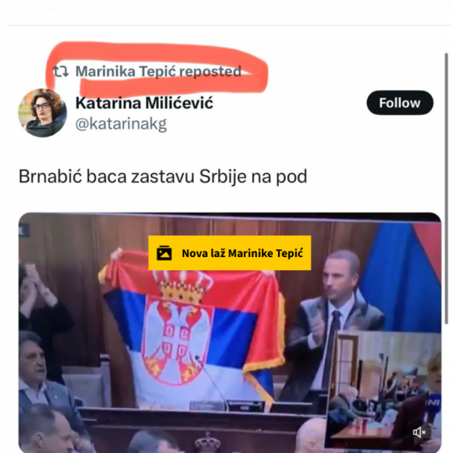 Marinika Tepić pokušala je još jednom da obmane srpski narod tvrdnjom da je predsednica Narodne skupštine Ana Brnabić bacila zastavu Srbije na pod, što ona nije učinila.