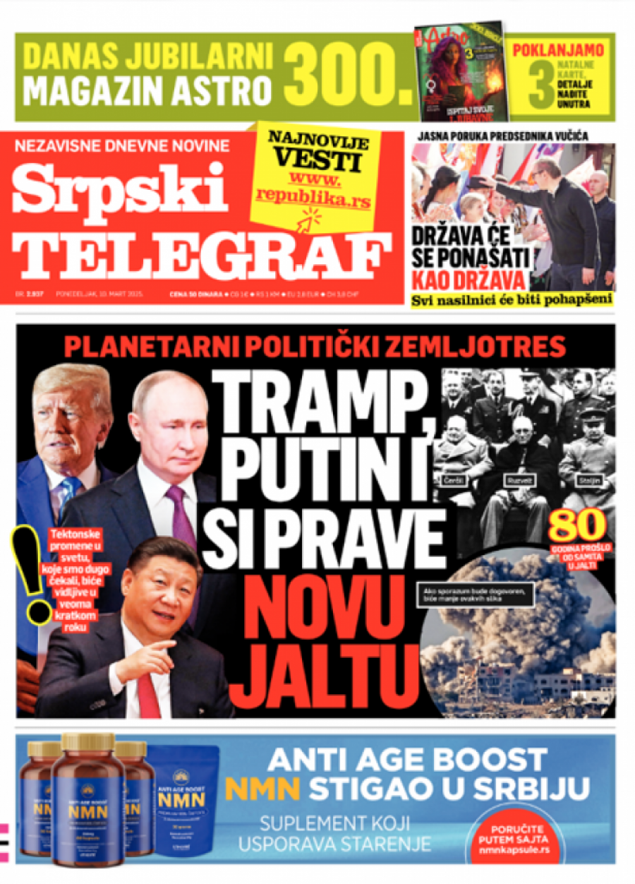 Srpski telegraf u izdanju za ponedeljak 10. mart 2025. donosi pregršt novih i zanimljivih priča!