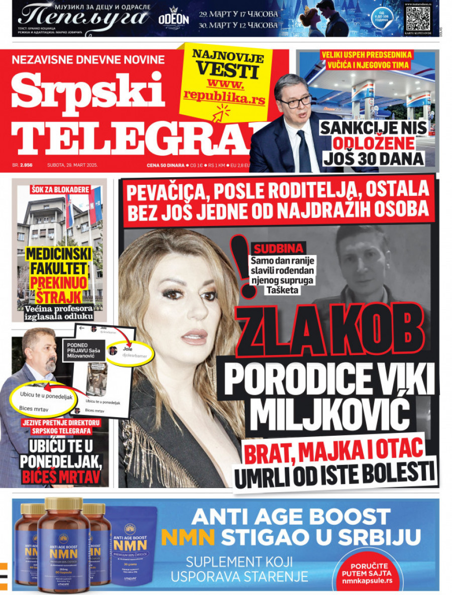 Naslovna strana Srpskog Telegrafa za 29. mart 2025. godine!