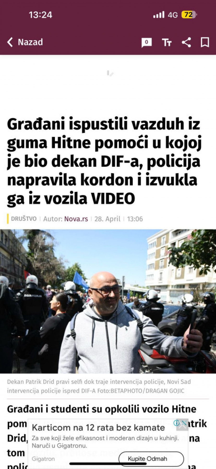 Dodao je da je najstrašnije što je povređen profesor i dekan tog fakulteta Patrik Drid i da okupljeni nisu dozvolili Hitnoj pomoći da odveze povređenog dekana.