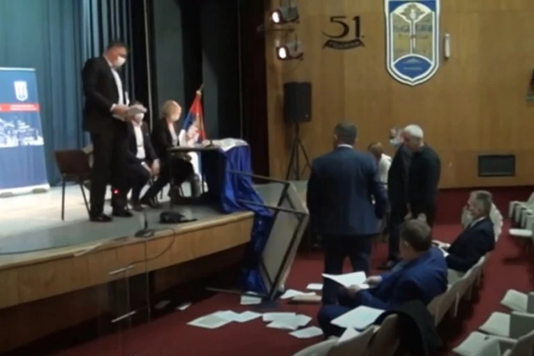 Najpre su odbornici na čelu sa bivšim predsednikom opštine Dimitrijem Paunovićem izašli i blokirali govornicu, a zatim su porušili stolove za kojim sede predsedavajući, njegov zamenik i sekretar skupštine.