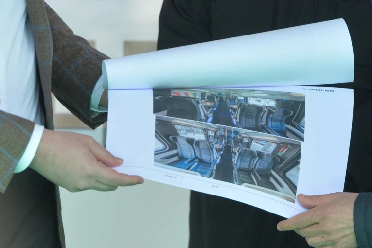 Vučić je pokazao i fotografije dve kompozicije dabl-deker vozova naručenih iz Švajcarske za koje je dodao da je reč o izuzetno komfornim vozovima, posle čega je pokazao i fotografije unutrašnjosti tih vozova, odnosno kako izgledaju i sedišta...
