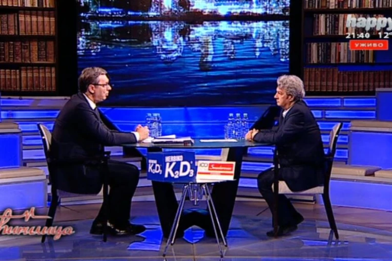 Foto: printscreen/TvHappy- To je lažna politika, nema te je, pa onda nalaizte zaveru. Srbija je kažnjena time što je imala lošu vlast koja je za 1.400 evra prodaval tenkove. Zato su i držali tu vlast, da bi mi bili loši. Tenkovi su sečeni, pa prdavani. i to po ceni od 1.400 evra po komadu. Vi, Mariću i Dragan Vučićević ste u pravu niste ništa slagali, to je sve istina - objasnio je Vučić.