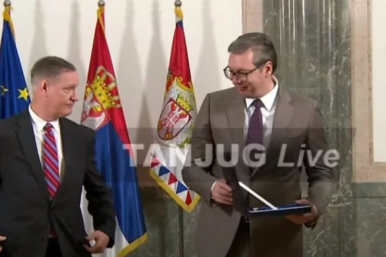 Foto: printskrinNakon susreta, Vučić je uručio odlikovanje general-majoru Stajversu - Orden srpske zastave drugog stepena za naročite zasluge u razvijanju i učvršćivanju miroljubive saradnje i prijateljskih odnosa između Republike Srbije i Sjedinjenih Američkih Država.