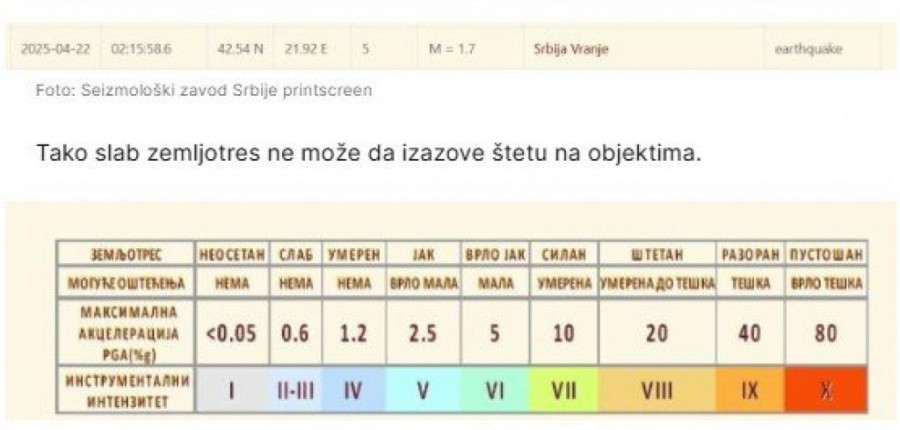 Foto: Printscreen/Seizmološki zavod Srbije