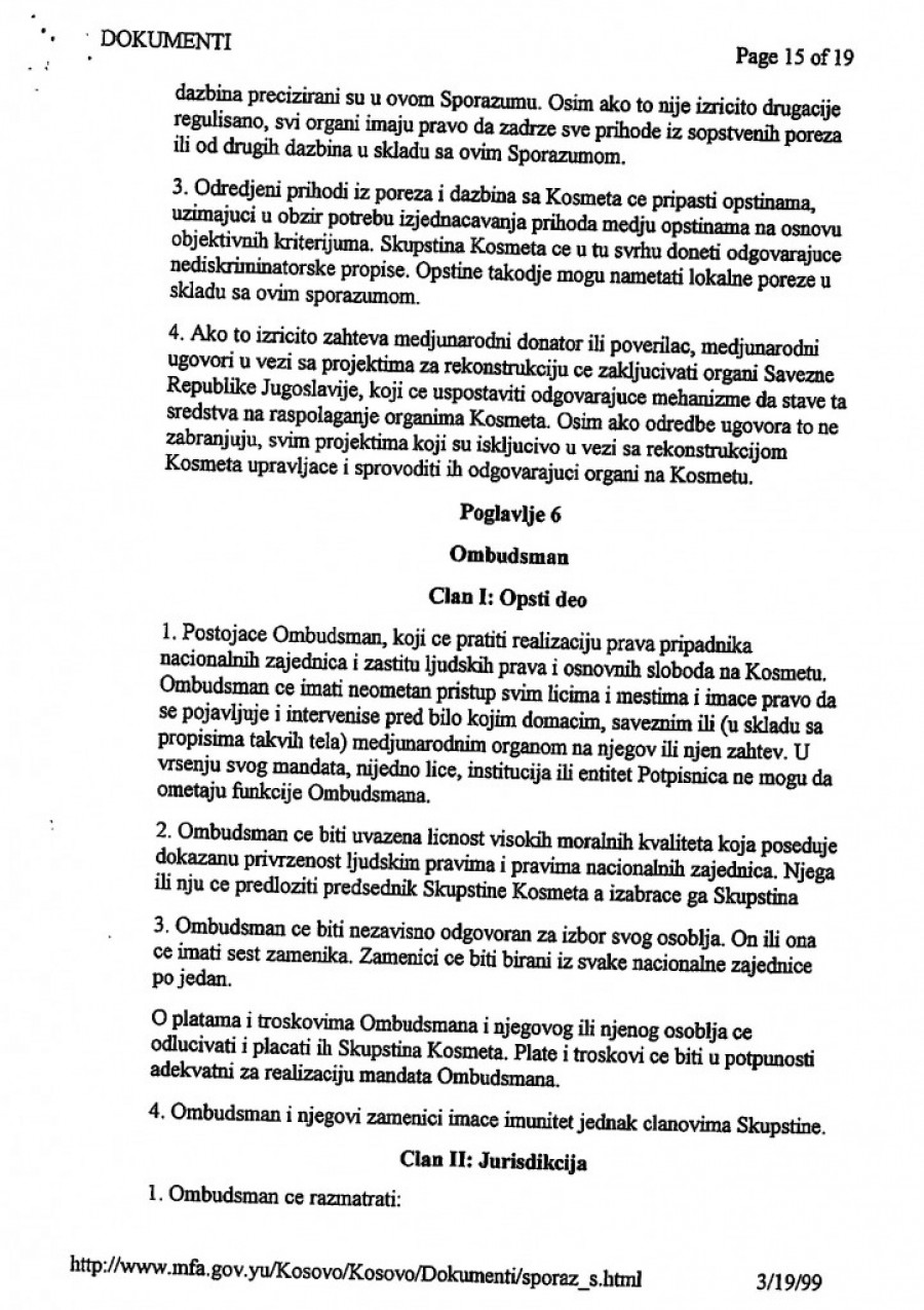 Srpski telegraf je ekskluzivno došao do dokumenta koji su 18. marta 1999. potpisali predstavnici Vlade Srbije i Vlade SRJ zajedno sa predstavnicima sedam etničkih zajednica koje žive na Kosovu i Metohiji. U pitanju je sporazum o samoupravi na Kosmetu koji je na Miloševićev nagovor sastavio tadašnji potpredsednik Vlade i šef pregovaračke delegacije Ratko Marković, predavši ga kao konačni predlog Srbije, ali on nikad nije uzet u razmatranje.