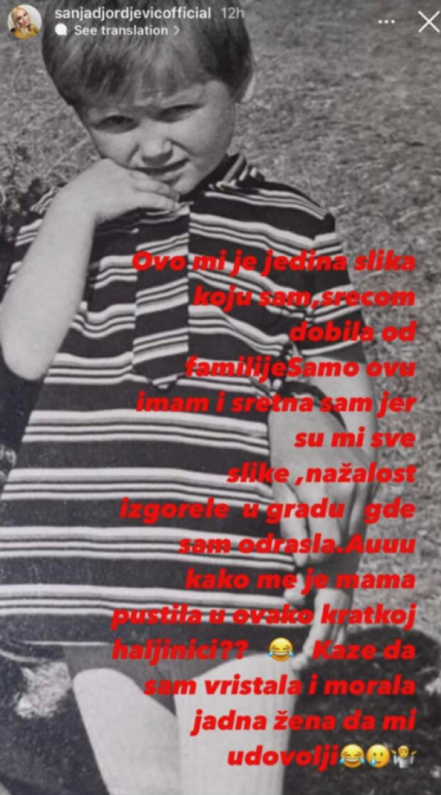 - Ovo mi je jedina slika koju sam srećom dobila od familije. Samo ovu imam i sretna sam jer su mi sve slike, nažalost, izgorele u gradu gde sam odrasla. Au, kako me je mama pustila u ovako kratkoj haljinici? Kaže da sam vrištala i morala jadna žena da mi udovolji - napisala je Đorđevićka.