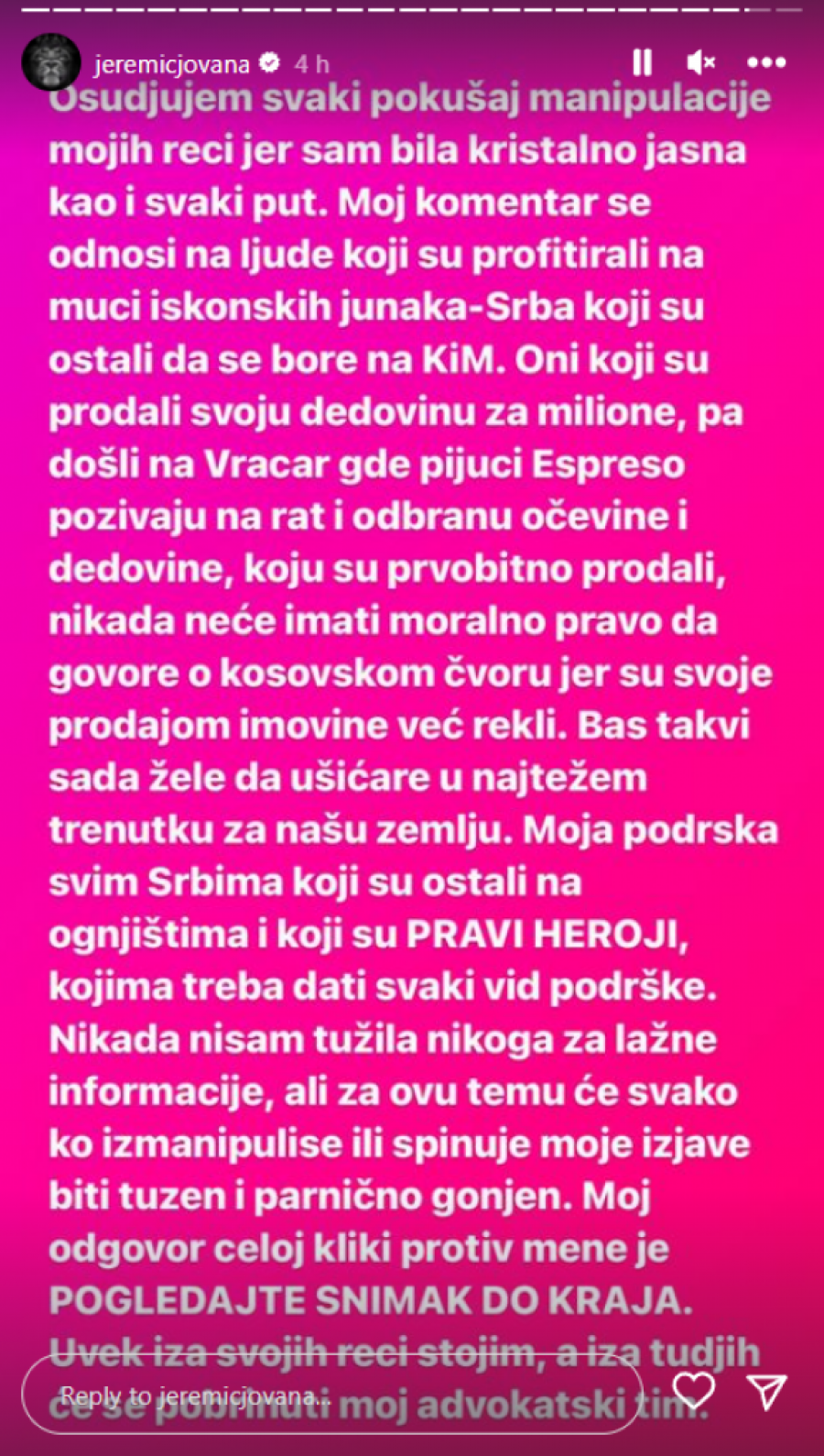 - Moja podrška svim Srbima koji su ostali na ognjištima i koji su pravi heroji, kojima treba dati svaki vid podrške. Nikada nisam tužila nikoga za lažne informacije, ali za ovu temu će svako ko izmanipuliše ili spinuje moje izjave biti tužen i parnično gonjen. Moj odgovor celoj kliki protiv mene je pogledajte snimak do kraja. uvek iza svojig reči stojim, a iza tuđih će se pobrinuti moj advokatski tim - napisala je Jovana na Instagramu.