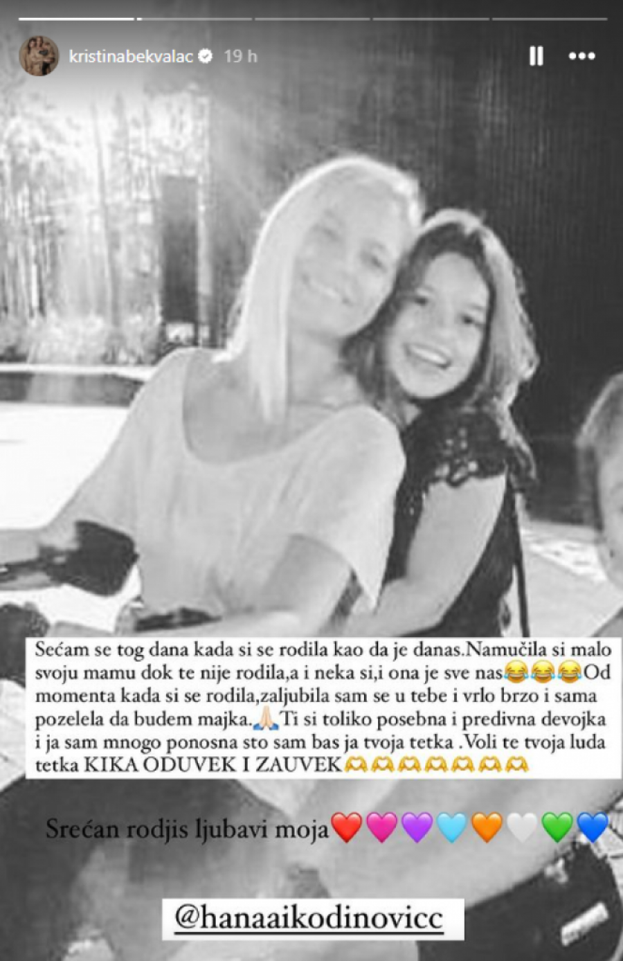 - Sećam se tog dana kada si se rodila kao da je danas. Namučila si malo svoju mamu dok te nije rodila, a i neka si, i ona je sve nas! Od momenta kada si se rodila, zaljubila sam se u tebe i vrlo brzo i sama poželela da budem majka. Ti si toliko posebna i predivna devojka i ja sam mnogo ponosna što sam baš ja tvoja tetka. Voli te tvoja luda tetka Kika oduvek i zauvek. Srećan rođus ljubavi moja - napisala je Kristina na Instagram storiju.