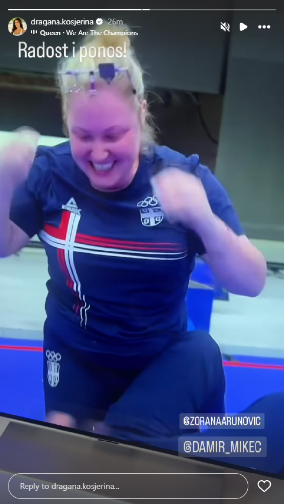 Ovim povodom oglasila se i voditeljka RTS, Dragana Kosjerina, koja je na društvenoj mreži Instagram podelila snimak slavlja naših sportista nakon što su shvatili da su osvojili zlato, ne krijući koliko ju je ova vest obradovala.