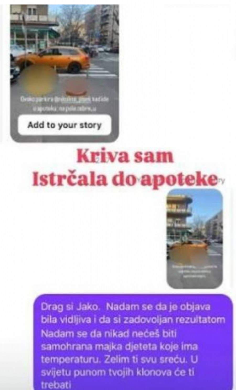 "Ovako parkira Nikolina Pišek kad ide u apoteku, na pola zebre", uz emotikon koji se može smatrati nepristojnim. Nakon što je voditeljka podelila ovu objavu na svom storiju, odgovorila je korisniku porukom u kojoj je priznala svoju grešku i poželela mu sve najbolje.