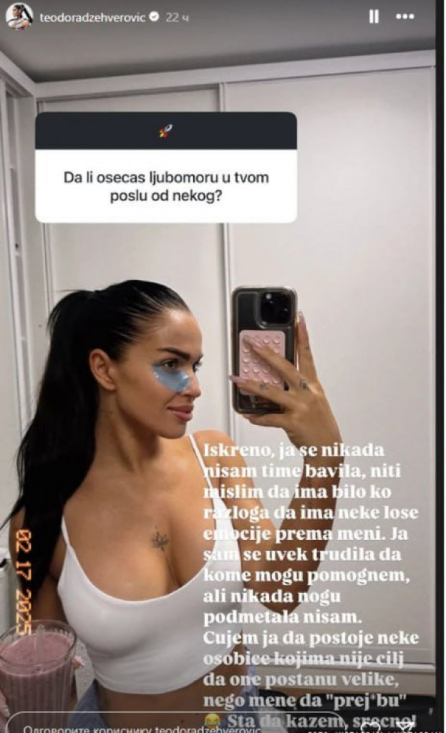 Pevačica Teodora Džehverović, poznata po svojim muzičkim hitovima, nedavno je otvorila dušu o estetskim korekcijama koje je podvrgnula tokom svoje karijere. Foto: printskrin