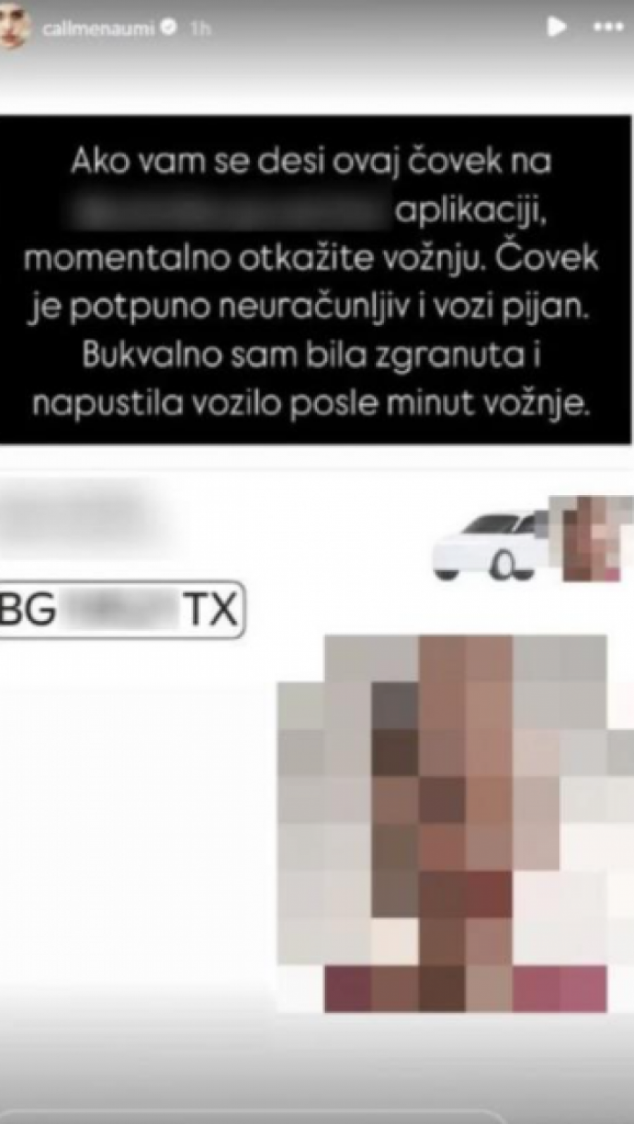 Mina Naumović, popularna ličnost i influenserka, nedavno je podelila neprijatno iskustvo koje je doživela tokom vožnje taksijem. Na svom Instagram profilu, obratila se svojim pratiocima upozoravajući ih na potencijalno opasne situacije. Opisala je kako je naišla na vozača koji je bio očigledno pod uticajem alkohola, što je izazvalo njeno zaprepašćenje.