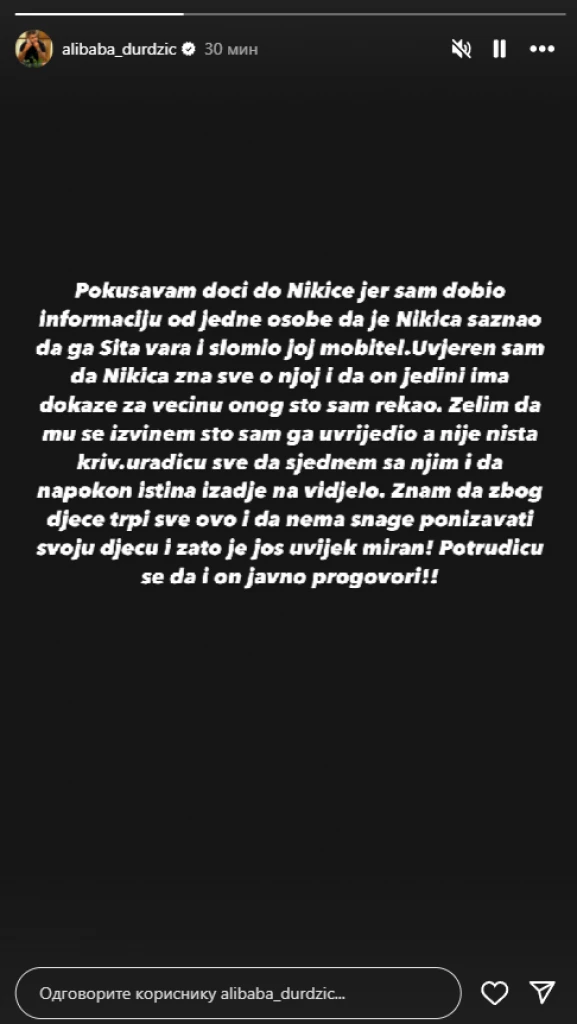 - Pokušavam doći do Nikice, jer sam dobio informaciju od jedne osobe da je Nikica saznao da ga Sita vara i slomio joj mobilni. Uveren sam da Nikica zna sve o njoj i da jedini ima dokaze za većinu onoga što sam rekao. Želim da mu se izvinim što sam ga uvredio, a nije ništa kriv. Uradiću sve da sednem sa njim i da napokon istina izađe na videlo. Znam da zbog dece trpi sve ovo i da nema snage ponižavati svoju decu i zato je još uvek miran. Potrudiću se da i on javno progovori - napisao je Asmin.