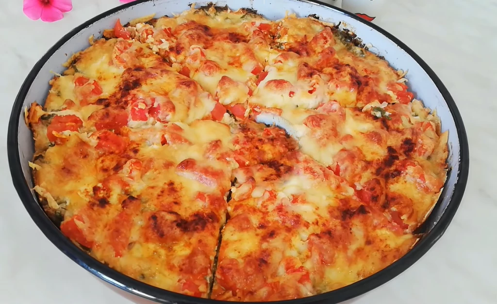 Prvo, u posudi pomešajte iseckani hleb i prelijte ga mlekom. Dodajte 60 g parmezana, jaje i malo soli. Dobro sjedinite smesu, a zatim je podelite na dva dela. Zatim, u tiganj utisnite polovinu smese sa hlebom, ravnomerno raspoređujući da prekrije dno tiganja. Preko toga stavite šunku, sir, isečene čeri paradajze i pospite origanom i preostalim parmezanom. Na kraju, prekrijte sve drugom polovinom smese od hleba, lepo je raspoređujući i utiskujući.