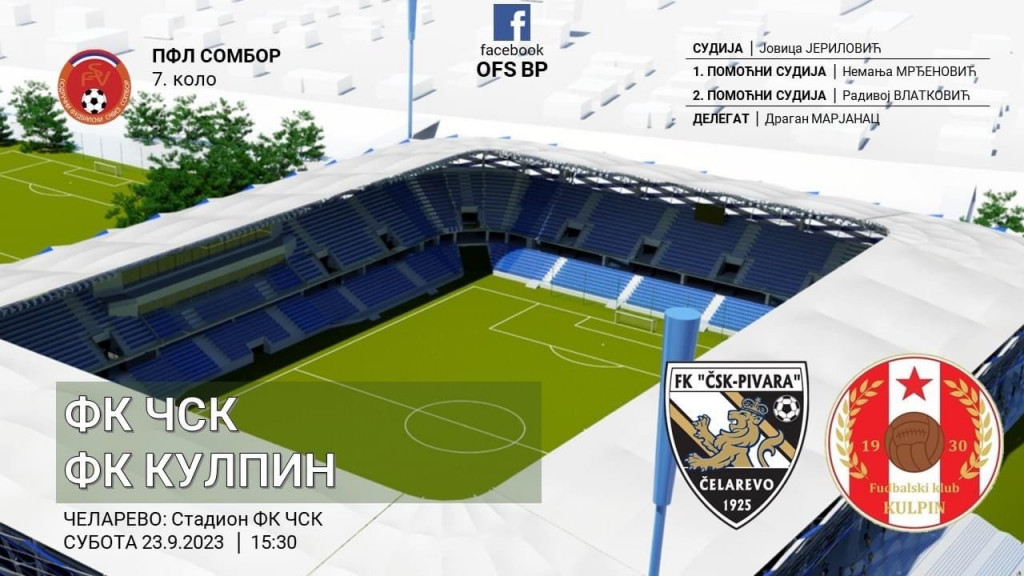 U okviru 7. kola Područne lige Sombor, čelarevski ČSK dočekuje Kulpin. U dosadašnjim mečevima domaćin je zabeležio maksimalan učinak na svom terenu, dok je Kulpin sva tri ishoda iskusio do sad u gostima.