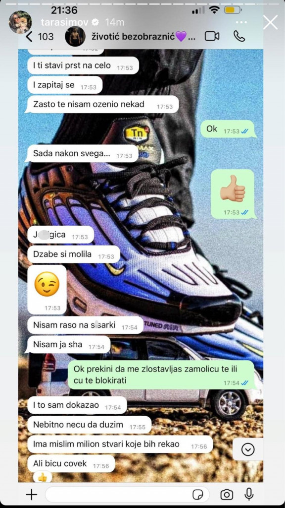 - Shodno tome da sam javna ličnost i negde osećam potrebu da neke stvari objavim, tako ću i ovo. Danilo i ja smo se razišli na njegovu želju i dogovorili smo se da je tako bolje i za nas i za naše zdravlje. Molim vas za razumevanje vezano za ovu situaciju i da ako možete ne vršite pritisak na nas. Hvala - napisala je Tara Simov na Instagramu, a zatim i objavila njihove zajedničke prepiske: