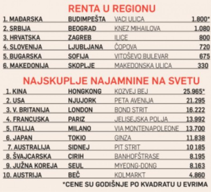 U regionu je, u odnosu na našu prestonicu, jedino skuplje iznajmiti lokal u Vaci ulici u Mađarskoj, gde jedan kvadratni metar godišnje košta 1.800 evra