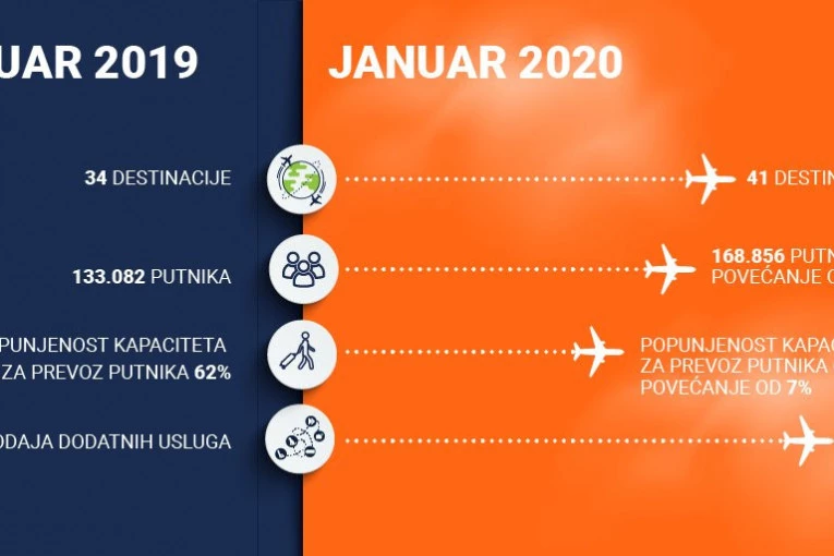 Foto: PromoTokom prvog meseca ove godine ukupno je prevezeno 168.856 putnika sa beogradskog aerodroma, što je za gotovo 36 hiljada, odnosno 27 odsto, više u odnosu na isti period prošle godine. To ujedno predstavlja i najbolji rezultat za januar od pokretanja Er Srbije 2013. godine. Istovremeno, popunjenost kapaciteta za prevoz putnika (Load Factor) na letovima iz Beograda povećana je za 7 procentnih poena u odnosu na januar 2019. Pored toga, broj destinacija Er Srbije iz sprske prestonice porastao je sa 34 na 41, dok je prodaja sve popularnijih dodatnih usluga povećana za 44 odsto, u poređenju sa istim mesecom prosle godine.