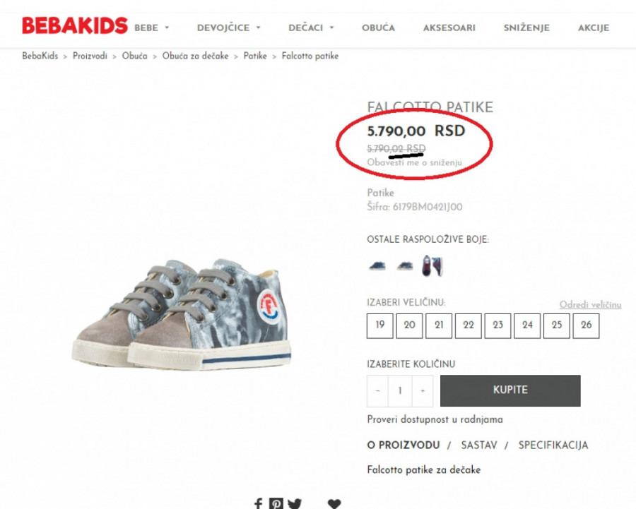 Foto: bebakids.com/printscreenTako naturino patike posle "velikog" sniženja više ne koštaju 7.490,01 dinar, već okruglo 7.490. Još veću uštedu će ostvariti oni roditelji koji se odluče za patike falcatto, jer će oni imati još veći popust od čak dve pare. Na sniženja od svega dinar ili 99 para već smo navikli, međutim, u ovom slučaju su otišli i korak dalje.