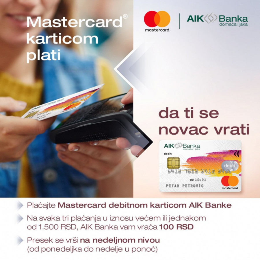 Klijentima AIK Banke koji bezgotovinsko plaćanje obave (ili izvrše) beskontaktno Mastercard debitnom karticom na POS terminalima ili Onlajn - AIK Banka vraća 100 RSD na račun.