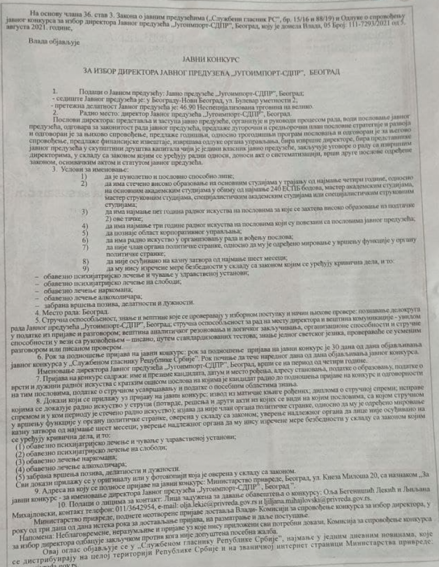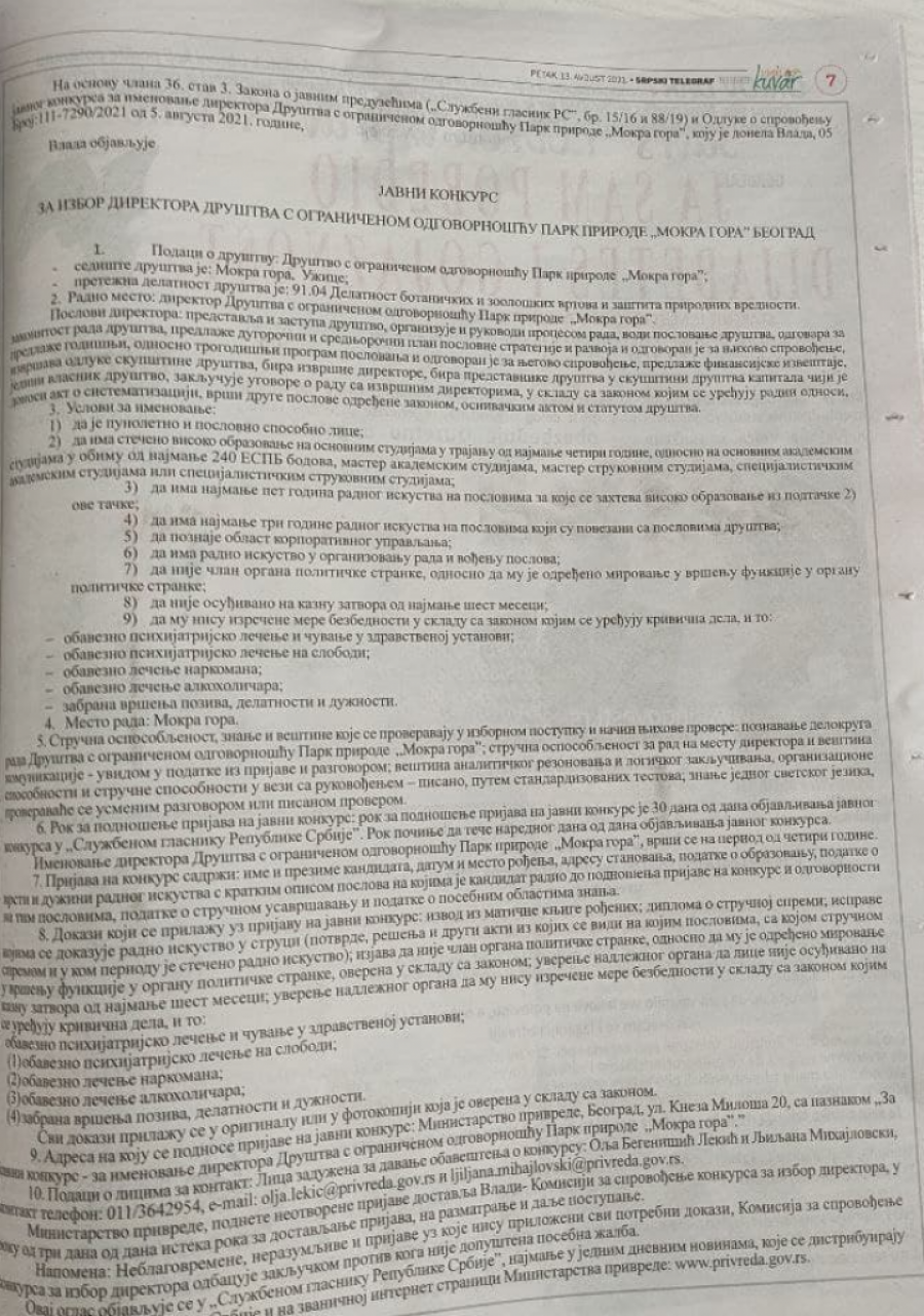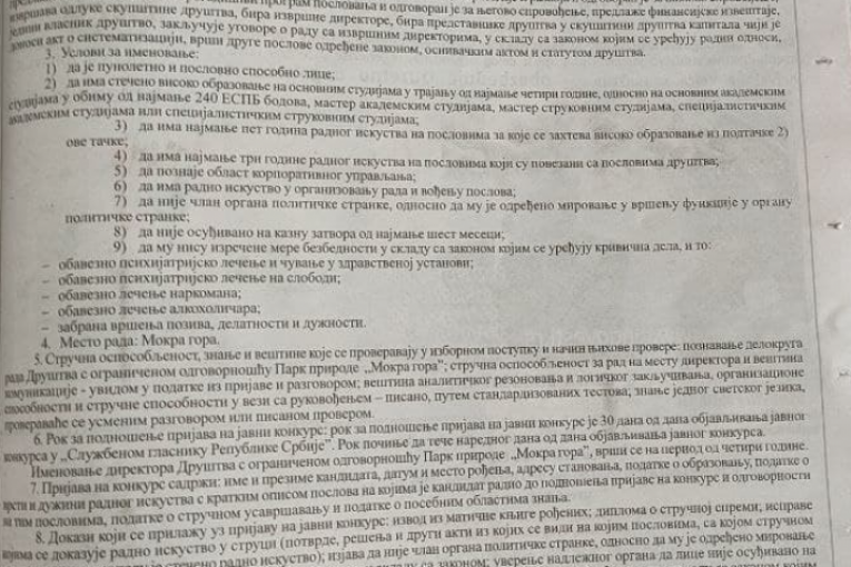 Gotovo identični uslovi raspisani su i u slučaju kandidata za direktora preduzeća "Park prirode Mokra Gora".