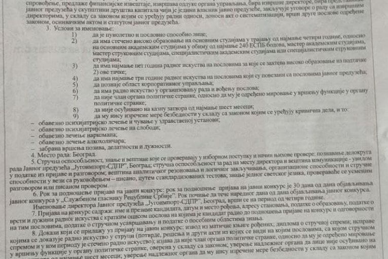 Uz to, kao jedan od uslova za ovaj posao, navodi se da zainteresovani koji konkurišu nisu članovi organa političkih partija, odnosno, preciznije rečeno, da mu je određeno mirovanje u vršenju funcija u stranci.