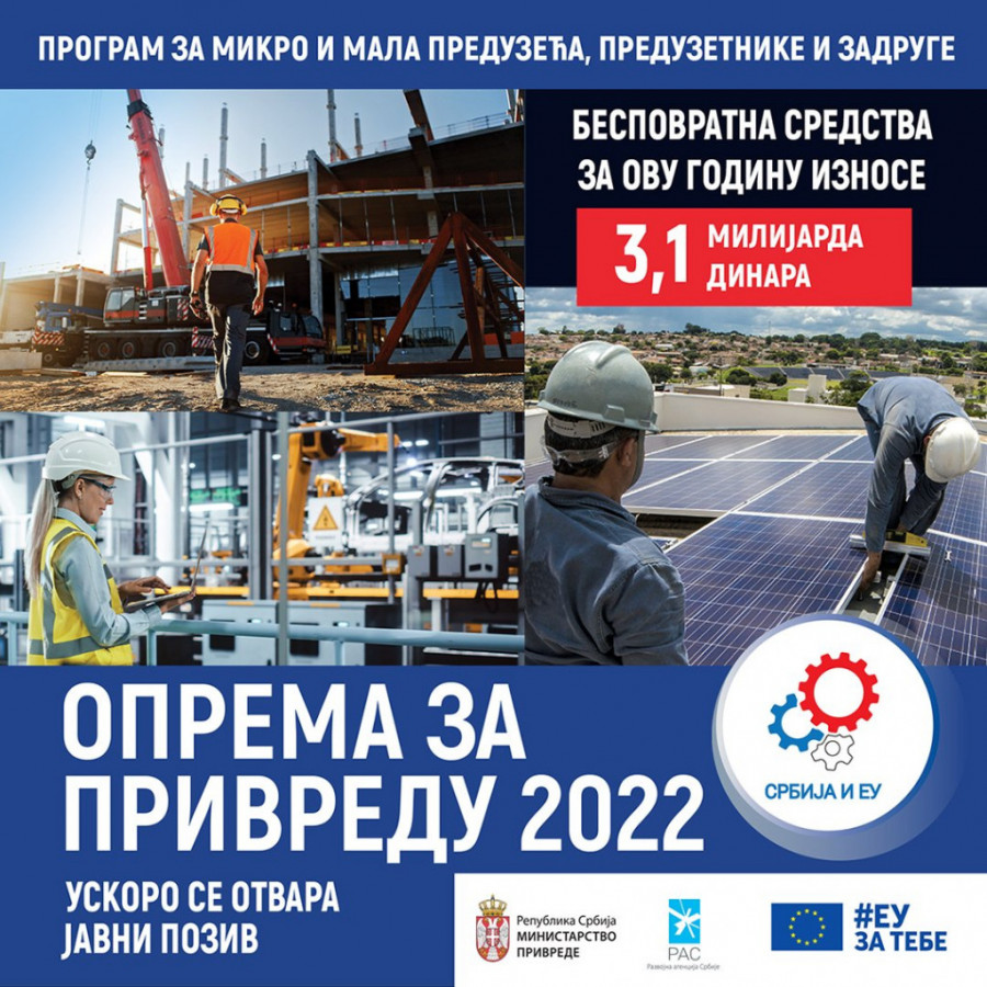Mikro i malim preduzećima, zadrugama i preduzetnicima, kroz novi program "Srbija i EU - oprema za privredu", na raspolaganju je rekordni iznos od oko 3,1 milijardu dinara bespovratnih sredstava za kupovinu nove opreme. Tim sredstvima biće podržano oko 600 firmi, ukazano je prilikom predstavljanja programa podrške u resornom ministarstvu.