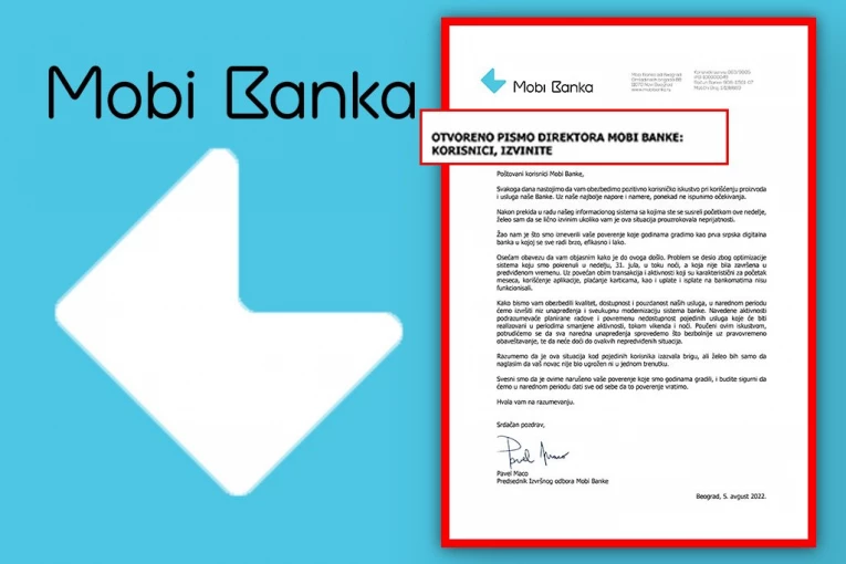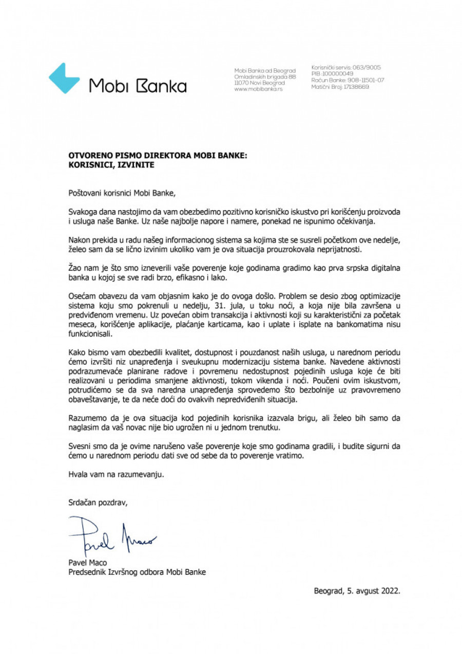 Pavel Maco, predsednik Izvršnog odbora Mobi Banke, uputio je otvoreno pismo izvinjenja svim korisnicima nakon prekida u radu sistema Banke početkom nedelje.