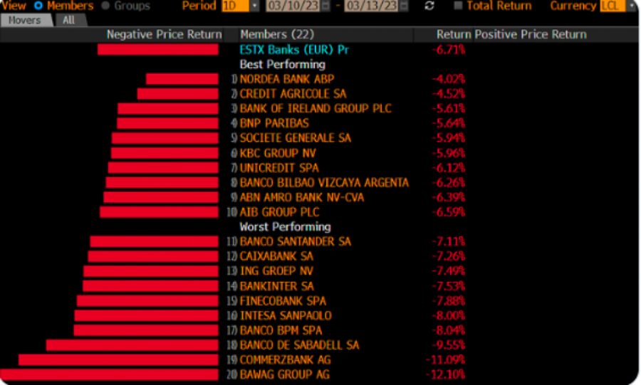 Krah SVB sasvim sigurno se odrazila i na Evropu, gde su neke od najvećih banaka u regionu zabeležile najveći pad akcija u poslednjih devet meseci, dok je evropski bankarski indeks zabeležio pad od 4,4 odnosno najveći jednodnevni pad od početka juna - i pre nego što je "Silikon veli benk" otišao u stečaj u petak.