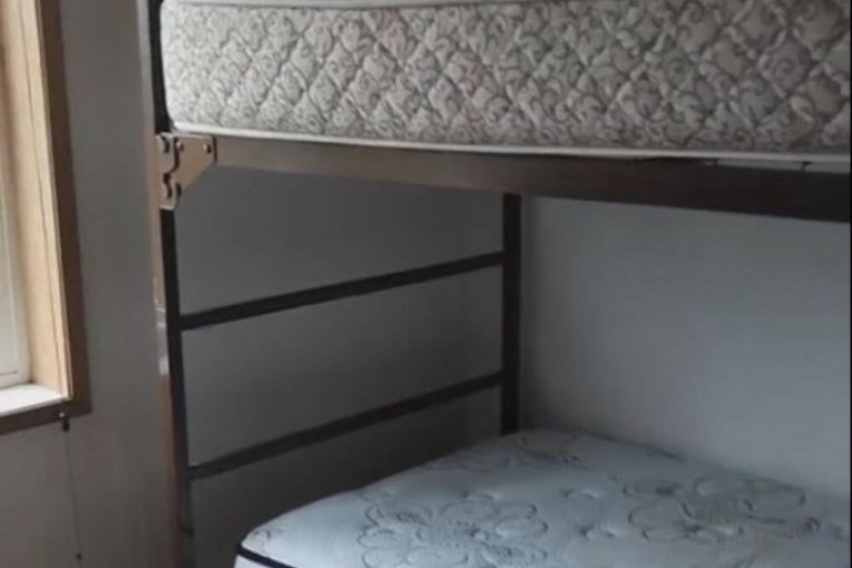Možete videti da se ovde nalaze dva kreveta na sprat, imamo ukupno četiri dušeka. Ovde će biti smeštene tri devojke, jedna sam ja. Dve devojke će biti ista smena, jedna će biti sama u smeni.