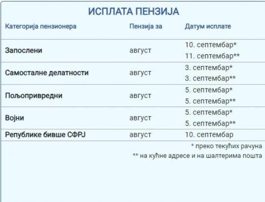 Stiže isplata penzija za mesec avgust korisnicima iz kategorije zaposlenih, koji svoje penzije primaju putem tekućih računa, što je danas, 10. septembra, dok oni koji su odabrali da svoja primanja imaju isporučene na kućnim adresama ili šalterima pošta, ona vas očekuju sutra, što je objavio i Republički fon za penzijsko i invalidsko osiguranje (PIO).