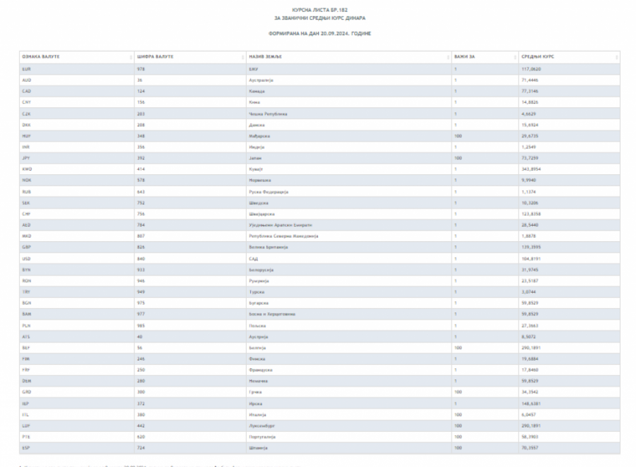 Narodna banka Srbije saopštila je da će zvanični srednji kurs dinara prema evru iznositi 117,0620 dinara za jedan evro, što predstavlja minimalnu promenu u odnosu na prethodni dan.
